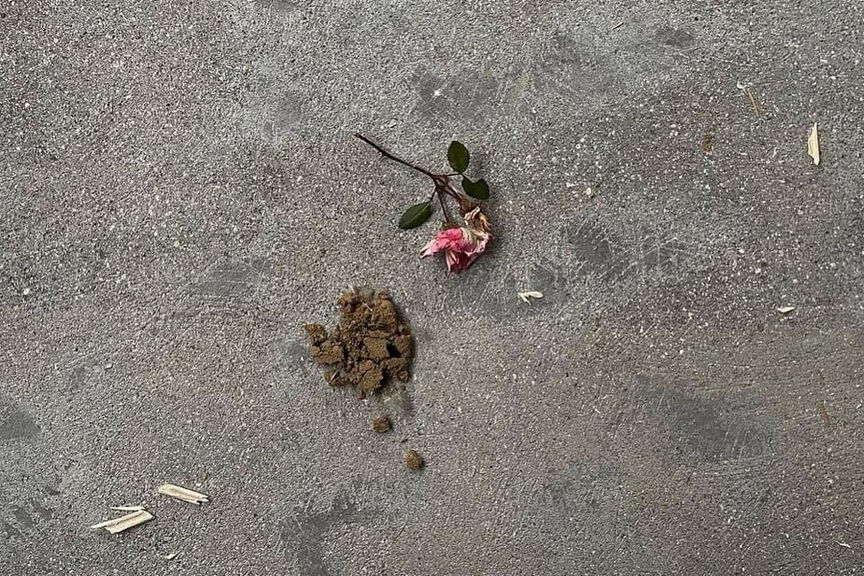 窓をすべて開け放したビル4階からは、長田の街や間近を通る電車、晴れの日は明るい陽射しと青空、曇り雨の日は淡い光と道の雨水を跳ねて行くタイヤ音。夕方の斜陽、夜の灯り、電車の音、ビル風。私は、花と土と水を持って行きました。水は、長田の街中の川へ降りて汲みました。土と水をこねて、小さな玉状に掴んで置く→花を添える→土を置く→花を添える...何となくそれだけルールを決めて、繰り返し置きました。